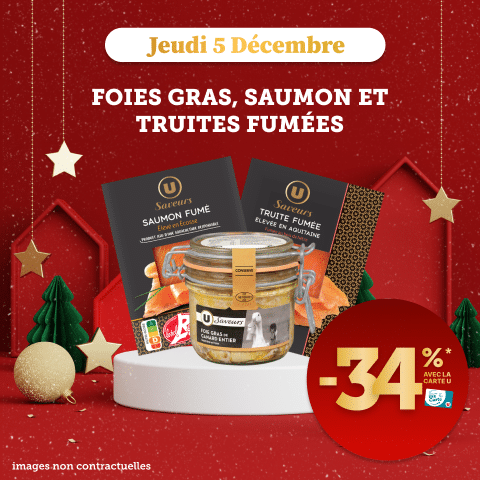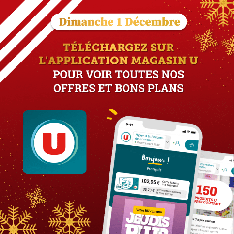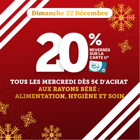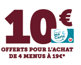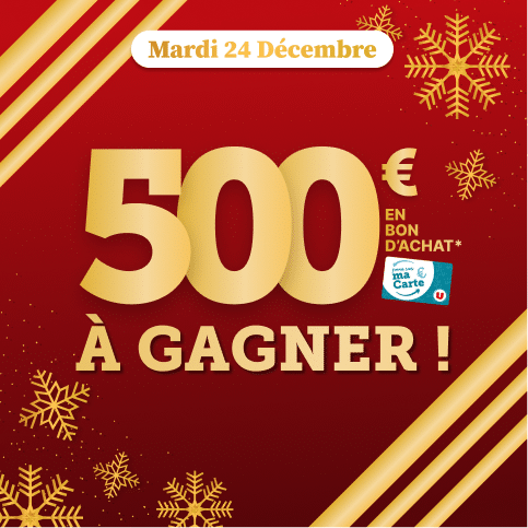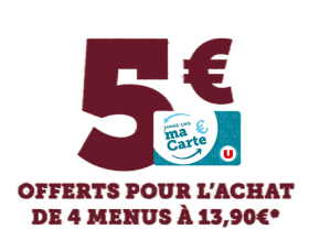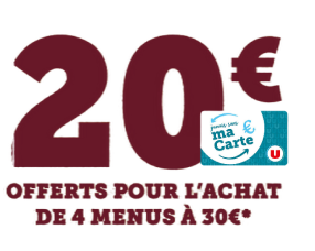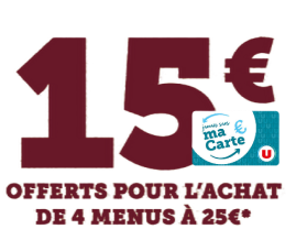 *Voir conditions en magasin. Offre réservée aux Clients Carte U à partir de 50€ d’achats, effectués en une seule fois (hors services, carburant, gaz, livres, presse et Carte Cadeau U). Une seule prime offerte par compte Carte U, sur présentation du bon émis en caisse et de la Carte U. Valable dans les magasins participant à l’opération et dans la limite des stocks disponibles.
